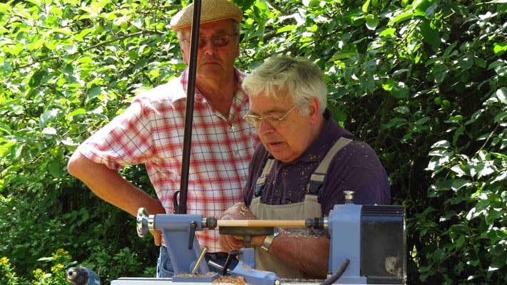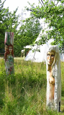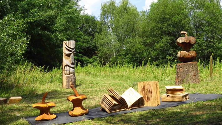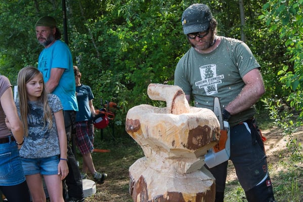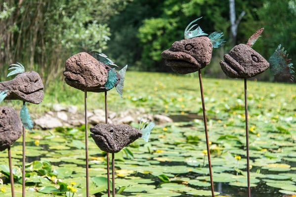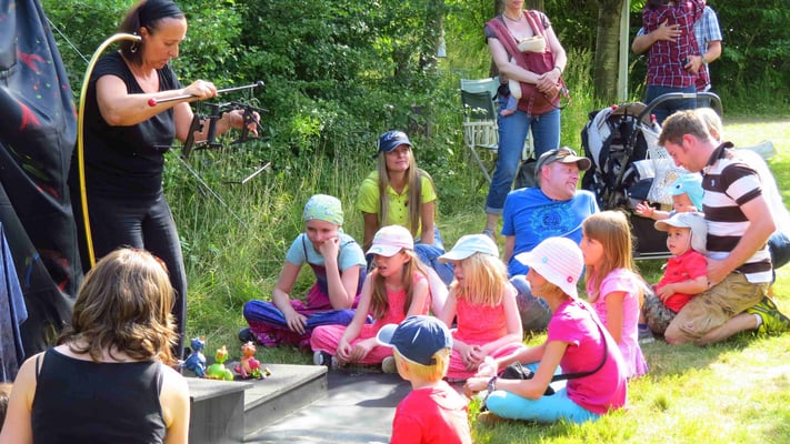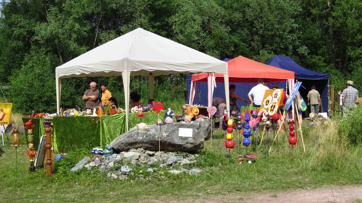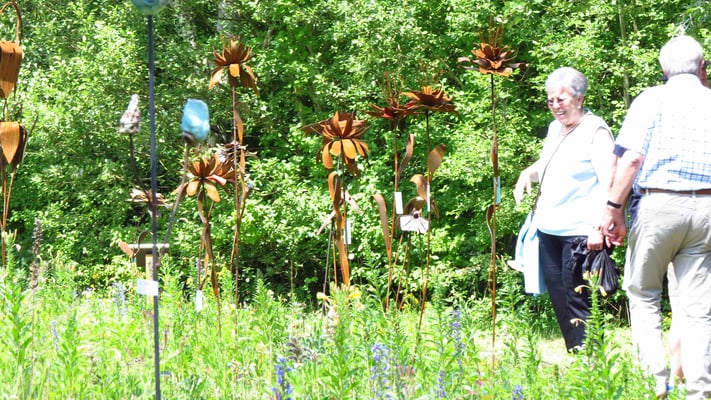 30 Künstler aus der Region zeigten ihre Werke aus den unterschiedlichsten Materialien. Der naturnahe Garten bot dafür eine berauschende Kulisse. Figuren und Bilder wurden in Bäumen platziert, im See konnte man ein Schiff, Frösche und Figuren bewundern, im blühenen Magerrasen ragte florale Kunst aus Metall in die Höhe. Viele der Aussteller zeigten den Besuchern wie ihre Werke entstehen. Kunst geht auch mit einer Kettensäge, was besonders die Männer erfreute. Wie eine Künstlerin ihren Schmuck herstellte, fanden die Mädchen interessanter. Mitmachaktionen für Kinder wurden begeistert angenommen. Papierkunst, basteln mit Naturmaterialen, Insekten bestimmen im neu gestalteten Bauwagen und vieles mehr. Groß und Klein erfreuten sich an dem Spiel der zauberhaften Marionetten. Während die Kleinen beschäftigt waren konnten sich die Eltern eine Auszeit gönnen bei einer Klangschalenmassage. Getränke und eine kleine Brotzeit wurden im Garten angeboten. Zum gemütlichen Beisammensitzen gab es am Bernd Hofer Haus Speis und Trank und Live Musik mit den Salsaringern.