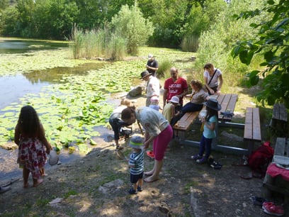 Über 40 Gäste kamen am Sonntag den 7. Juni, bei strahlendem Sonnenschein in den LBV Naturerlebnisgarten in Kleinostheim. Das Interesse an den Führungen und Aktionen ist ungebrochen, was nicht nur an dem schönen Gelände sondern auch an den vielseitigen Themen liegt. Thomas, David und Tanja Wolf erfreuten, wie schon so oft, Groß und Klein mit dem Thema Wasser. Bewaffnet mit Sieben und Pinsel, teilweise bis zu den Knien im See stehend, versuchte jeder etwas Interessantes aus dem Wasser zu schöpfen. Wasserflöhe, Kaulquappen, Wasserschnecken, kleine Fische und vieles mehr, wurden von der kompetenten Familie Wolf identifiziert und erklärt. Die Kinder hatten Spaß, auch wenn der Eine oder Andere mit dem Hintern im See landete. Manche Besucher machten einfach nur einen Rundgang um den schönen Garten kennen zu lernen.