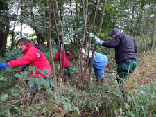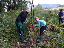 Am Samstag trafen sich LBV Mitglieder, bewaffnet mit Astscheren und Sägen, in Kleinkahl auf den LBV Flächen. Die Erlen an den Tümpeln treiben jede Menge Schösslinge aus, die es zu entfernen galt, um den Platz für andere Pflanzen zu erhalten. Schilf hatte seine schönen Kolben ausgebildet und im Frühjahr blühen hier die Märzenbecher. Ein Paradies für alle Insekten, Amphibien und Käfer. Mit vereinten Kräften wurden die kleinen Bäume entfernt, die sich jedes Jahr neu bilden und zu viel Schatten auf das Gelände bringen. Mit dicken Schuhen oder Gummistiefeln, wühlte man sich durch hohes Farn und Brombeerranken. Das Wetter spielte mit und allen machte die Arbeit Spaß. Besondere Freude aber hatten die Jüngsten. Mark und Patrick, acht und zehn Jahre alt, waren mit ihrem Vater Christoph gekommen und ließen alle staunen. Sie arbeiteten unermüdlich mit der Astschere, wie Profis schleppten sie abgeschnittenen Äste vom Gelände und wurden nicht müde. Mark erzählte stolz, dass er eben seinen ersten Baum gefällt hätte. Die Brotzeit in der Pause schmeckte da besonders gut. Da das Team so super zusammen gearbeitet hatte, war man gut vorangekommen und konnte noch eine andere Fläche in Angriff nehmen. An einem sandigen Hang, an dem Wildbienen sich eingraben, musste durch Freischneiden der Wand, der Anflug der Insekten erleichtert werden. Schnell wurde auch hier der Asthaufen am Straßenrand größer. Zum Bedauern der beiden Jungs war die Arbeit viel zu schnell beendet. Sie hätten gerne noch weitergemacht und freuen sich schon auf den nächsten LBV Einsatz. Wenn man sieht, wie die nächste Generation sich für die Natur einsetzt, brauchen wir uns keine Sorgen um deren Erhalt zu machen. Innerhalb kürzester Zeit waren alle zu einem Team zusammengewachsen und haben eine gute Arbeit geleistet. Der LBV bedankt sich noch einmal ganz herzlich bei den fleißigen Helfern. Vielleicht seid ihr ja das nächste Mal dabei, wenn es heißt, Flächenpflege beim LBV.