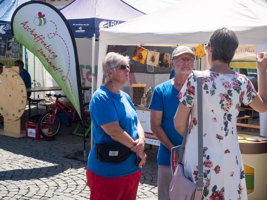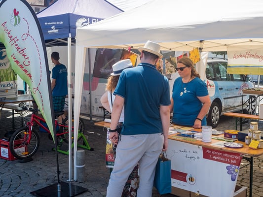 Unter dem Motto kunst ›kultur‹ klima fand am 03.07. der Tag der Franken in der Stadt Aschaffenburg statt. Passend zum Thema gab es auf dem Schlossplatz einen Zukunftsmarkt, auf dem wir als LBV gleich dreifach vertreten waren: Mit der Umweltstation Naturerlebnisgarten, der Regionalgruppe Aschaffenburg-Miltenberg und am Stand von „Aschaffenburg summt“.