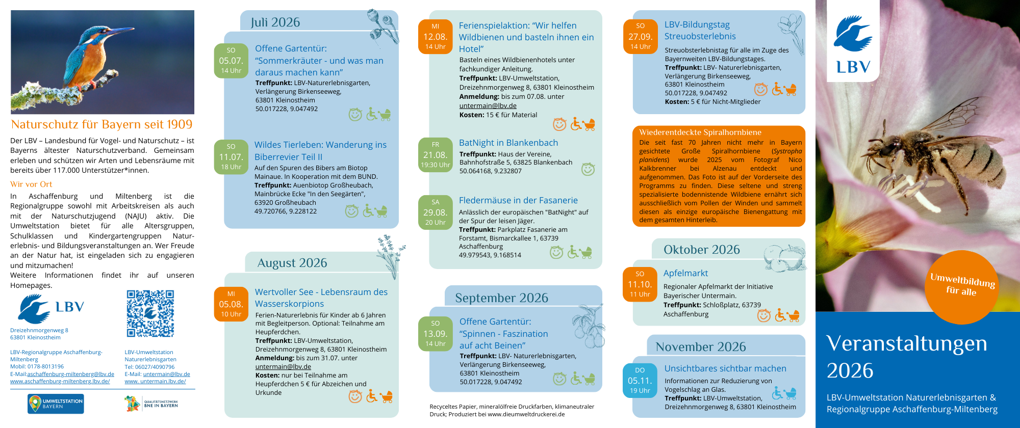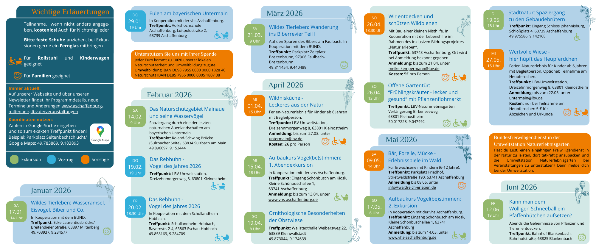 Hier weisen wir auf Veranstaltungen mit LBV-Beteiligung oder von LBV-Partner-Organisationen hin. Auch Veranstaltungen, die wir erst nach Druck des Flyers konzipiert haben, sind hier zu finden.
